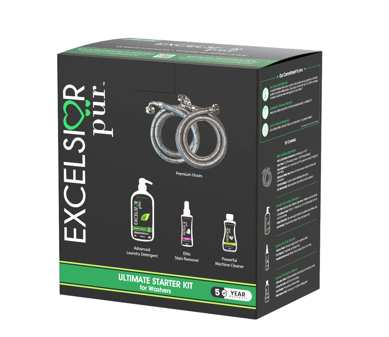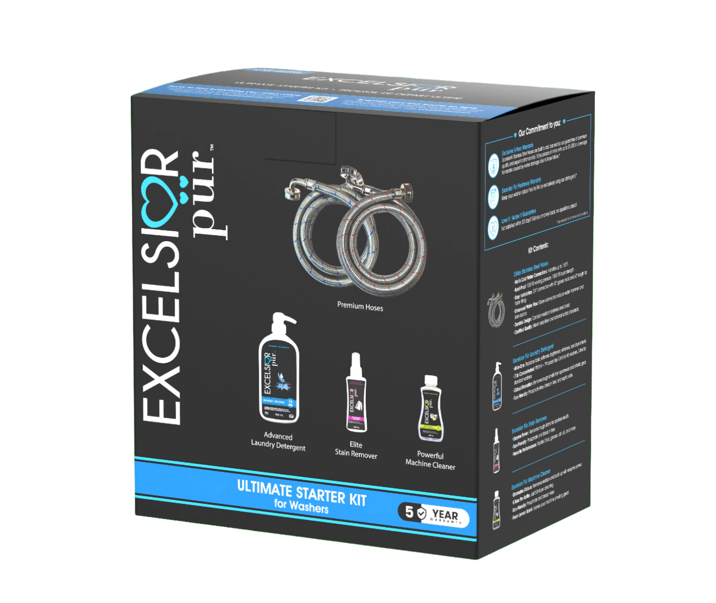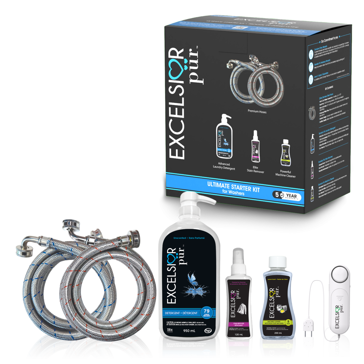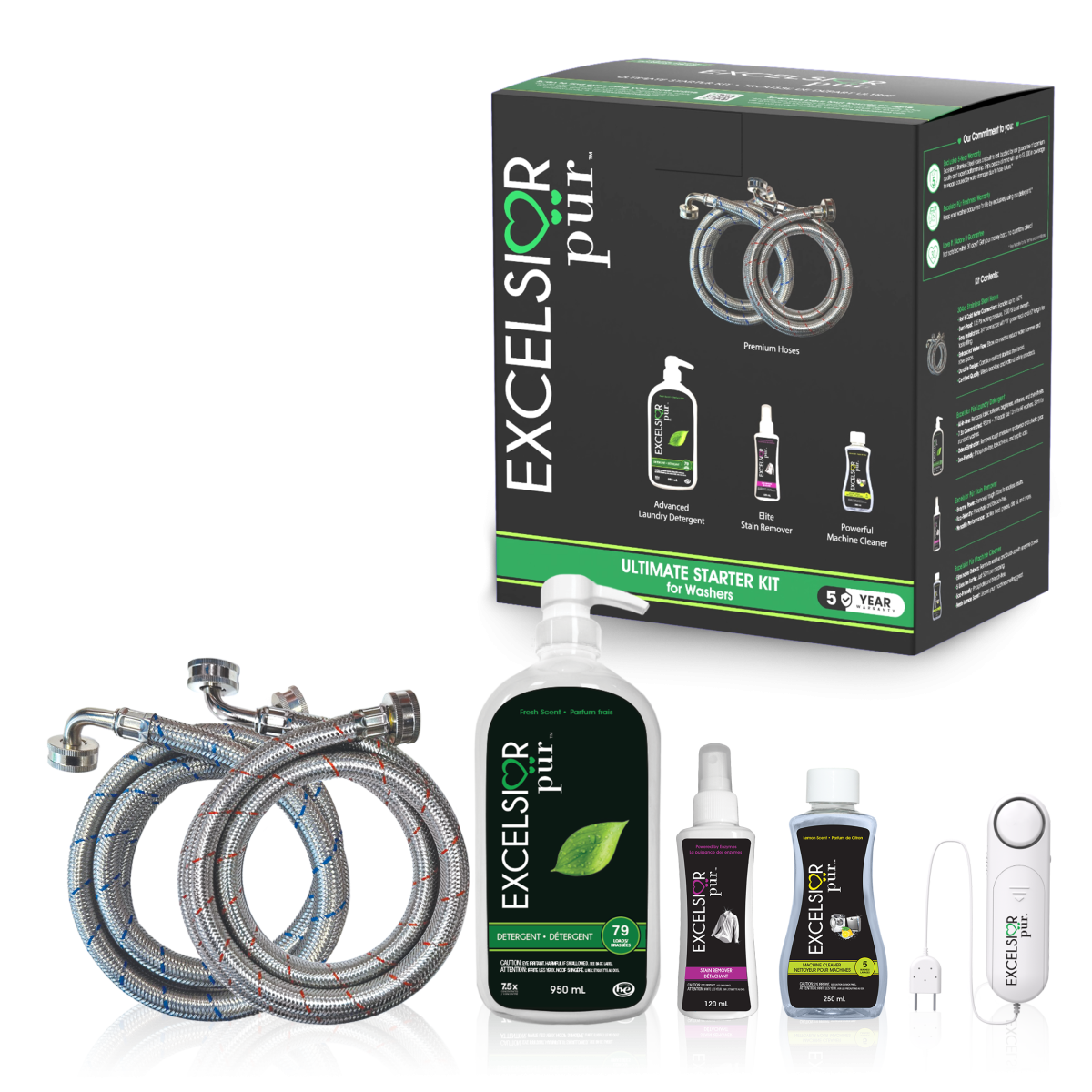The complete premium laundry care system in one box. The Ultimate Starter Kit includes a 950ml bottle of Excelsior Pür ultra-concentrated Laundry Detergent, 120ml Stain Remover, 250ml Machine Cleaner, and a set of premium stainless steel washing machine hoses backed by a 5-Year Warranty. Designed to protect your appliance, elevate fabric care, and deliver exceptional performance from day one.
